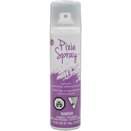 Create flawless stenciled designs with Pixie Spray Stencil Adhesive! This light tack, repositionable adhesive gently holds stencils in place but wont tear paper or leave a sticky residue behind. This inch package contains one 3.8 fl oz bottle of Stencil Spray. WARNING: FLAMMABLE WARNING: Choking Hazard. Not suitable for children under 3 years. Imported.