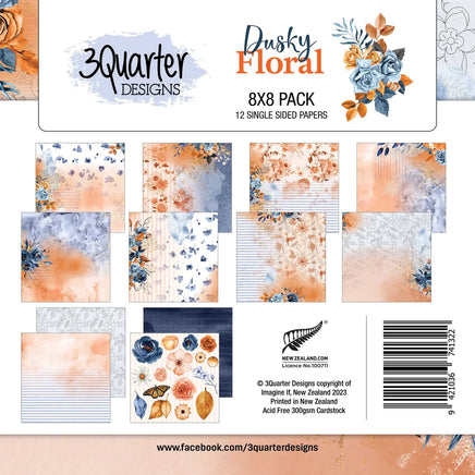 The Dusky Floral 8" X 8" Paper Pack in neutral cream, blue and orange tones has beautiful floral designs paired with the designer's signature mixed texture look, creating the 3Quarter Designs unique and versatile much-loved look. Perfect for projects for many occasions. The Dusky Floral collection includes a 12" x 12" Paper Pack, an 8" x 8" Paper Pack, a 6" x 6" Paper Pack and a 4" x 6" Card Pack. All sold separately. Designed and printed in New Zealand.