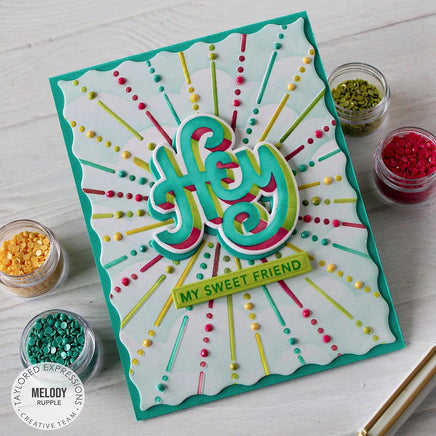 Add an explosion of color to your projects with the Bursting Dots Stencil! Choose your favorite colors to add a dynamic sunburst pattern of dots and dashes to your projects. Use it with various mediums like ink, TE Happy Medium, Simon Hurley Astro Paste, and more! For added dimension, use the Embossing Folder - Bursting Dots (sold separately) to elevate the pattern for more pronounced energy!