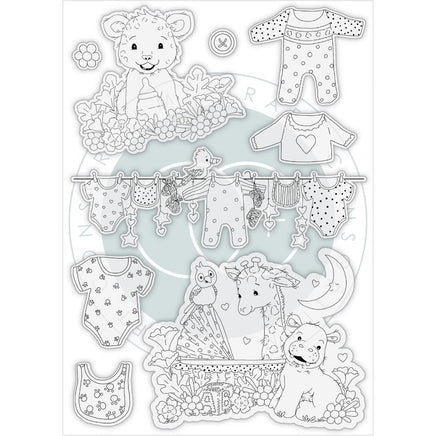 A5 premium clear photopolymer stamps set, with 9 stamps in coordinating designs. With protective acetate film printed with outline references, made in the UK.