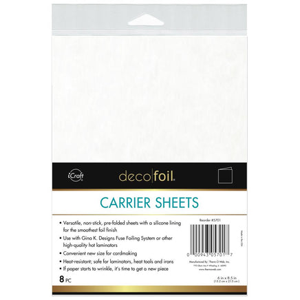 Deco Foil Carrier Sheets give the smoothest foil finish! Designed to be used as a reusable, heat-resistant carrier sheet when foiling with a laminator, these versatile, non-stick sheets are pre-folded for ease of use. 8 Sheets per pack, pre-folded 6 in x 8.5 in, Silicone lined on the inside.If paper starts to wrinkle, its time to replace it with a new sheet!