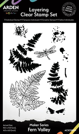 Measuring 4 in x 6 in, this versatile stamp set is perfect for a wide range of creative endeavours—whether you’re a scrapbooker, card maker, journaler, or mixed media artist. The beautifully detailed fern and dragonfly designs add a touch of natural elegance, while the useful splatters enhance your projects with a dynamic flair.