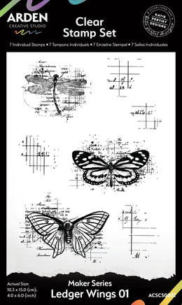 Ideal for enhancing your creative projects, these stamps measure 4 in x 6 in and are perfect for adding a whimsical yet elegant touch to your work. Whether you're creating intricate scrapbook layouts, personalized greeting cards, unique mixed media art or writing a journal, the Ledger Wings 01 Stamp Set offers a versatile and inspiring addition to your artistic toolkit. Bring your creations to life with the harmonious combination of ledger fragments and the delicate beauty of winged insects, all expertly designed by Katie Pertiet for Arden Creative Studio.