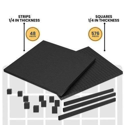 Have you ever wanted more than just one style of adhesive foam tape in a pack? Then look no further! This mega pack includes black foam tape thicknesses of 1/8 inches and 1/4 inches. That's 576 square pieces and 48 strips of each thickness.
