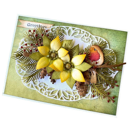The Winter Greenery Die Set is part of the Festive Holly Collection from Paper Flowers. This set of seasonal foliage includes pinecones, a branch, leaves, and berries to complement your festive floral projects. Perfect for adding texture, structure, and balance to your floral arrangements. This set includes 12 thin metal dies, with the largest measuring approximately 5.6x 1.3 (14.3 x 3.3 cm).