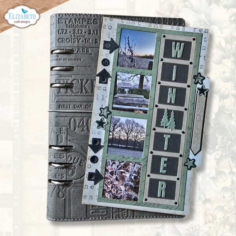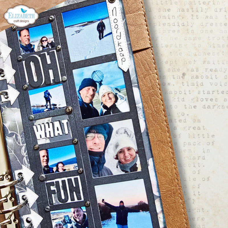 The Wintertime Wordstrip die set is part of the Winter Wanderlust Collection from Planner Essentials. This fun set includes a large die that allows you to create an element that is attached to your base pages with frames and decorative elements that include the words oh, what, fun, and winter. Perfect for adding photos and journaling to your projects. This set includes 15 thin metal dies, the largest of which is approximately 4" x 8" (10.1 x 20.4 cm).