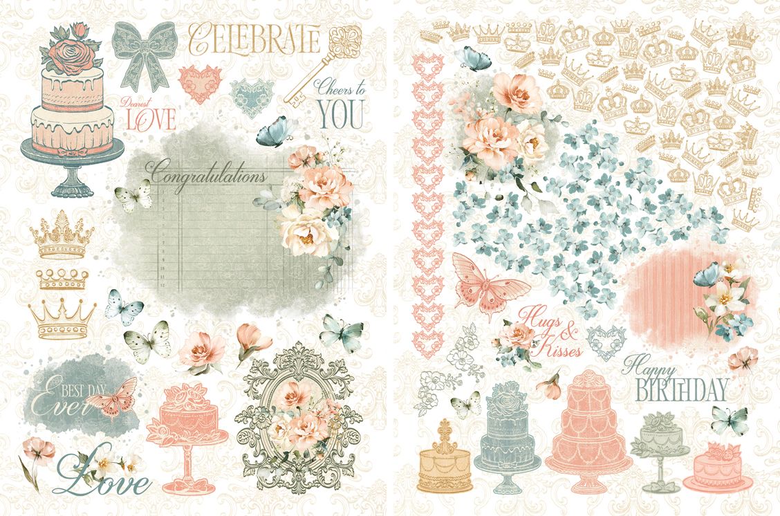 Celebrate timeless love and meaningful moments with Always & Forever, our newest paper collection inspired by feminine regency style and classic romance. A refined palette of regency blue, perfect muted pink, luxurious green, and glorious gold creates an elegant foundation, while charming imagery of bows, cakes, crowns, and ornate frames adds vintage sophistication.