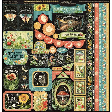 Step into the enchanting world of Graphic 45's new paper collection, Life is Abundant. This extraordinary calendar collection draws inspiration from the mystical allure of the forest, combining it with the timeless charm of a lunar calendar. It's a journey through nature's hidden wonders, where lush green foliage, red-capped mushrooms, wide-eyed owls, captivating blue-winged moths, and flickering lightning bugs come to life against dramatic black backdrop. Immerse yourself in celestial mystique as zodiac signs seamlessly intertwine with the forest's beauty, adding a touch of cosmic magic to your creations. This collection is a treasure trove inspiration for all paper crafters, card makers, mixed media artists, and scrapbookers alike. This package contains 12x12 collection pack with stickers.