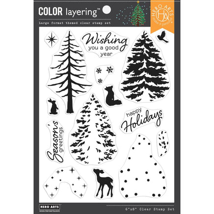 This latest color layering stamp set is sure to become a favorite. Create gorgeous trees for any season of the year. Build dimensional stamped images using this Color Layering stamp set. Use a different ink color on each stamped layer to build a beautifully colored image. Mix and match your favorite Hero Arts inks and see our coloring suggestions. Hero Arts 6 x 8 inch clear stamp sets offer the best quality in the market. They are made in the USA from genuine photopolymer, which is non-toxic, biodegradable, and beautifully transfers ink to paper for a true impression every time. Peel the stamp from its backing and stick to an acrylic block for easy positioning. Get this clear stamp set with coordinating Frame Cuts in SB376 Color Layering Seasonal Tree Bundle (sold separately). Made in USA.