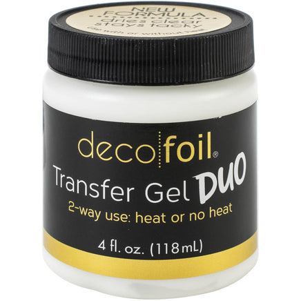 Deco Foil has reformulated the transfer gel to work with or without heat. You can transfer using heat or pressure from a die-cutting machine. Permanent transfer medium that dries clear and remains tacky for easy use. This package contains 4oz of transfer gel. Conforms to ASTM D 4236. Made in USA.