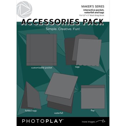 This Black Brag Book Accessory Pack is part of the Maker's Series Collection. This accessory pack coordinates with the 5.5 x 5 inch Black Brag Book. These extras are also black. This pack includes one customizable pocket, tags, folded tags, a waterfall set, and an extra flap. These extra pieces will allow you to build up your Brag Book and add those extra pictures and other memorabilia you might have. This accessory pack will definitely complete your Brag Book.