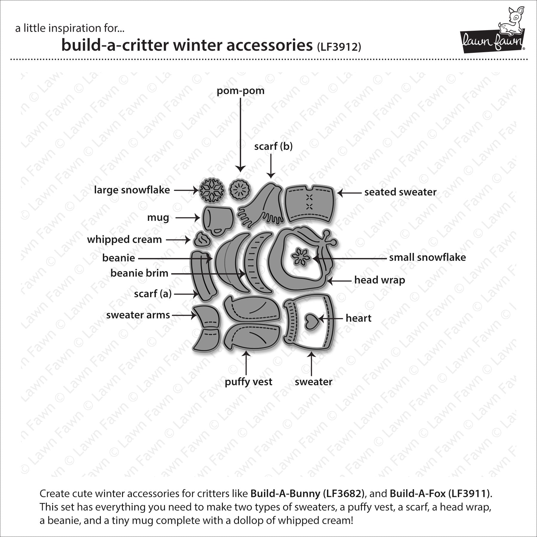 Dress your best for a chilly night with this cozy add-on! Perfect for your favorite Build-A-Critter! This set includes everything you need to make a cute sweater, puffy vest, scarf, head wrap, beanie, and a tiny mug. It even includes a dainty dollop of whipped cream!Coordinating Lawn Cuts: Build-A-Bunny, Build-A-Fox Coordinating set ideas: Play with your favorite colors of cardstock (shiny is super fun) or patterned paper for a custom look every time. This set has 15 pieces. Lawn Cuts custom craft dies are high-quality steel and are compatible with most die cutting machines!