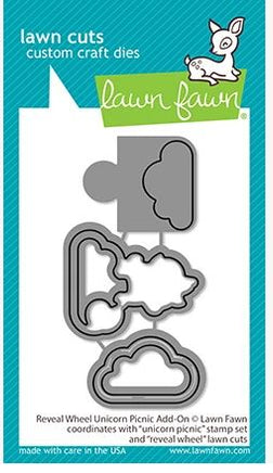 Lawn Fawn custom craft dies are made of 100% high-quality steel, compatible with most die-cutting machines, and will inspire you to create cute crafts! This package contains Reveal Wheel- Unicorn Picnic Add-On: four dies measuring between 1.125x.625 inches and 1.375x1.5 inches. WARNING: Choking Hazard- small parts. Not for children under 3 years. Made in USA.