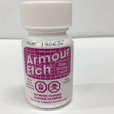 Armour Etch Canadian labeling (for our Canadian customers) is a fast acting specially formulated glass etching compound that lets you create permanent etched designs on windows, mirrors and household glassware.