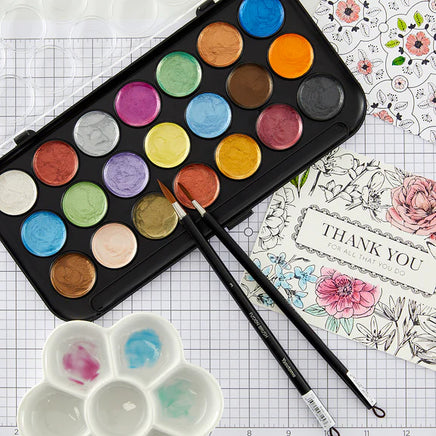 Yasutomo Niji Pearlescent 21 Color Watercolor Palette is a Yasutomo fan favorite. These pearlescent watercolors create stunning effects alone and with other water-based media. Similar in performance to more expensive pearlescent watercolors, these are highly pigmented. Comes in a portable hinged case. Non-toxic. Conforms to ASTM D-4236.