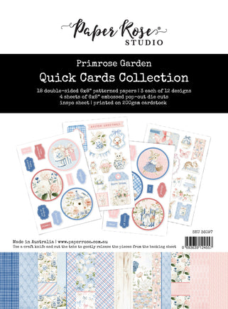 Bring Easter magic to life with the Primrose Garden Easter Collection, a celebration of spring in soft blue and pink tones. The papers in this Quick Cards set burst with charming details—adorable animals in Easter attire, decorated eggs, festive baskets, blooming florals, and fancy bow motifs. The die cuts in this set complement the papers featuring adorable animals, Easter eggs, Easter baskets, beautiful florals and butterfly imagery, plus festive sentiments to finish off your projects. Let the Easter-themed designs of this collection inspire you to create something truly special.
