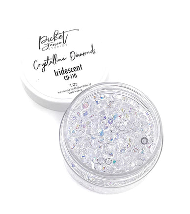 One of the newest additions to Picket Fence Studios ever growing collection of embellishments are Crystalline Diamonds.  These beautiful 3D diamond shaped gems add just the right touch to many types of cards and your everyday crafting needs.  They are approximately 4.2 mm in size and made of very light weight plastic.  Crystalline Diamonds are considered semi-transparent which allow stunning hues of the rainbow to shine through.  1 oz. jar.