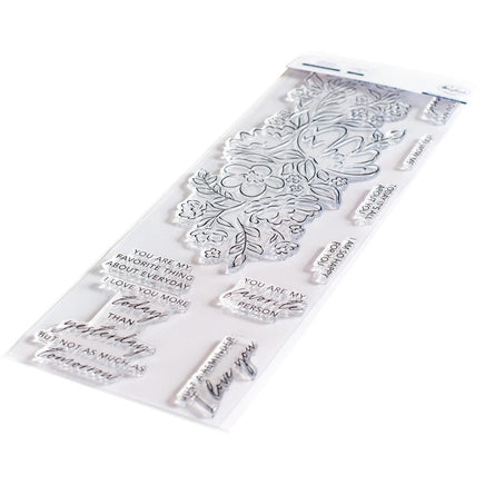 4 x 12 photopolymer slimline clear stamp set designed by Inna Moreva. Made to coordinate with the You Are My Favorite die set and the You Are My Favorite stencil set. Available for purchase separately. This outline floral cluster, measuring 3.675x 8.675 inches, fits perfectly and was designed specifically for slimline card creating! Easily ink blend the 3 different layers with the coordinating set of stencils in our premium dye inks, or color them with your favorite medium. The florals & leaves are perfect for all types of coloring; including watercolor, alcohol & brush markers, colored pencils and no-line coloring. Finish by telling someone how much you love them with one of the heartfelt sentiments included in this slimline stamp set!