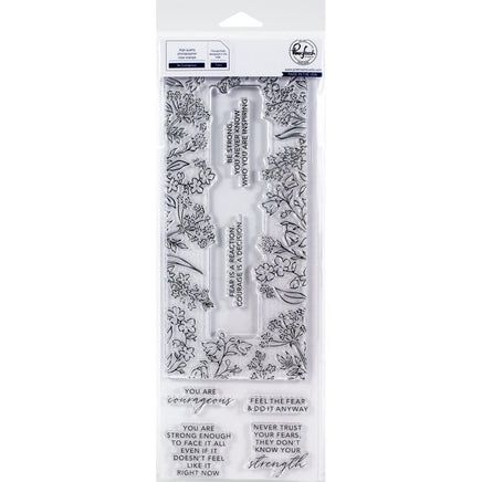 4 x 12 photopolymer clear stamp set designed by Inna Moreva. Made to coordinate with the Be Courageous die set and the Be Courageous stencil set. Available for purchase separately. ***Please note that you will need a large stamping platform or clear block to use this stamp set.(with stamping area of 8.75 inches or more in length) This sketched outline floral illustration, measuring 3.625 x 8.625, fits perfectly and was designed specifically for slimline card creating! Easily ink blend colors to the blooms and leaves with the coordinating set of stencils, or color them with your favorite medium. They are perfect for using with liquid watercolor, colored pencils, markers and more! Finish your card off using one of the encouraging and uplifting sentiments about courage.