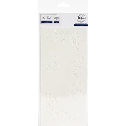 3 piece slimline layering stencil set made to coordinate with the Be Courageous stamp set. There is a separate stencil for the leaves, small blooms and larger blooms. Use them without the stamped image for a soft, ink blended floral background. Use the cling stamp to add more detail to the image by stamping in detail black, or heat embossing in gold. Be Courageous stencils measure approximately 4X9 inches.