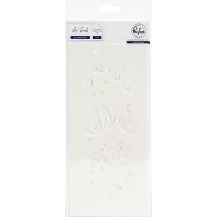 3 piece slimline layering stencil set made to coordinate with the Be Courageous stamp set. There is a separate stencil for the leaves, small blooms and larger blooms. Use them without the stamped image for a soft, ink blended floral background. Use the cling stamp to add more detail to the image by stamping in detail black, or heat embossing in gold. Be Courageous stencils measure approximately 4X9 inches.