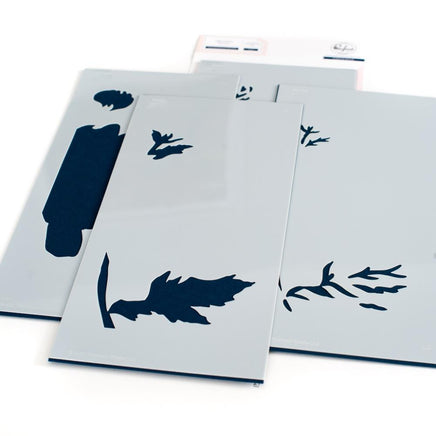 - available for purchase separately. There is a separate stencil for each layer, with guidelines on each stencil for perfect alignment when using alone. When using the stencils with the stamped images you will forego the alignment guides, and instead align each layer to the stamped images. Use them without the stamped image for a soft, no-line coloring feel. Use the coordinating stamp to add more detail to the image by stamping with detail black, or heat embossing in your favorite powder. Imported.