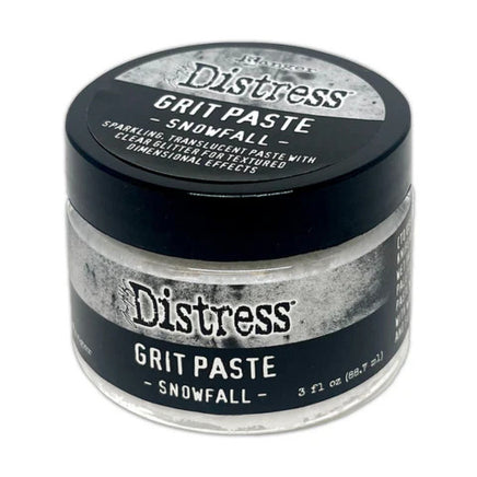 Tim Holtz Distress Holiday Mixed Media Medium Snowfall Grit Paste will add a touch of texture to Winter Holiday creations. Snowfall Grit Paste is a dimensional translucent medium infused with a clear glitter that dries to a textured sparkle finish. Apply to projects with Distress Palette Knife.