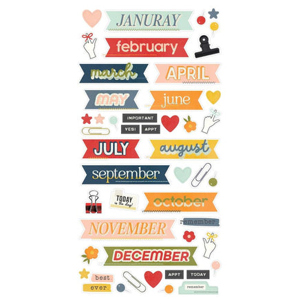 12 Month Spiral Bound Calendar including one 6x12 sheet of Months and Icons and two 6x12 sheets of Calendar Numbers 448 stickers and four 12x12 sheets of Large Die Cut Monthly Calendar Titles and Icons 181 Pieces.
