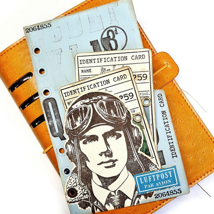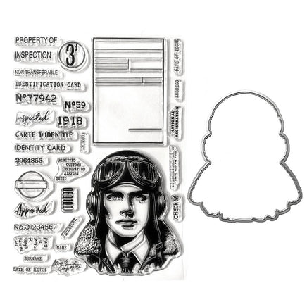 The The Property of Clear Stamp and Die Set is part of the Once in a Lifetime Collection from Planner Essentials. Designs include a masculine pilot with a coordinating die and various stamps that can be used to create travel documents and labels, including identification cards. This A5 (6 x 8) set includes 31 stamps, and one die, which is approximately 3.7 x 4.3 (9.4 x 10.9 cm)