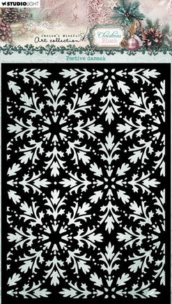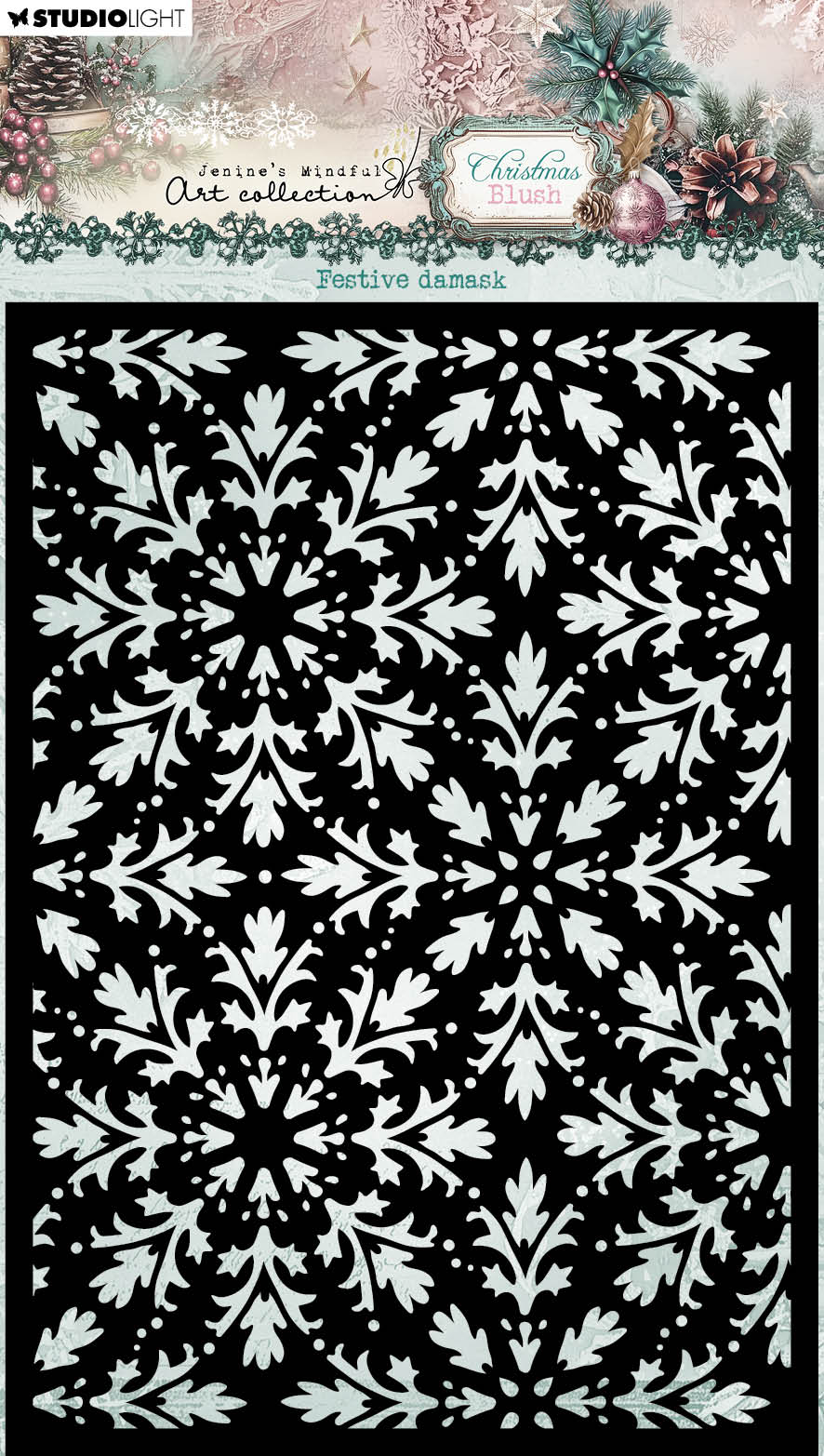Use this festive damask mask with your favourite inks, dies, paints and pastes to create beautiful borders and backgrounds for your Christmas and Winter cards, mixed media projects, journals and more. Part of Jenine's Mindful Art Collection.