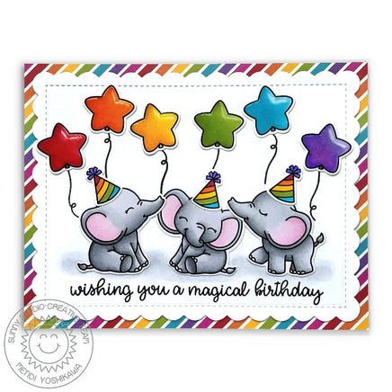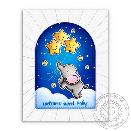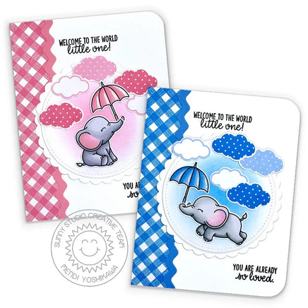 These gentle giants are too cute to resist! This sweet stamp set features 6 unique elephant images, along with coordinating clouds, stars, balloon and umbrella images for scene building and 8 mix & match words to create a number of playful greetings perfect for baby cards and so much more.