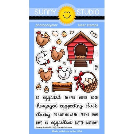 Create whimsical spring cards with our Clucky Chicken stamps featuring a hen house, roosting crate, 5 chickens, 4 chicks, a basket eggs and several smaller egg images. The set also includes eight playful punny greetings that mix and match to compliment the images.