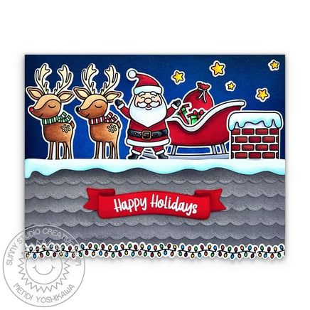 Santa and his reindeer are ready to deliver lots of fun this holiday season. This cute stamp set includes five unique reindeer, a harness, two Santa hats, two presents, two ornaments, a jingle bell and five mix and match Christmas greetings.