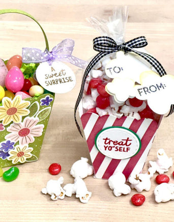 Assemble an adorable popcorn tub-style treat container with the Giftables - Treat Tub Die Set! This set includes a large die you'll cut twice to build one popcorn container, plus extra die pieces and embellishments to decorate your treat tub. You can even use the circle die to create a peek-in window so your recipient can see the treats inside. It's an easy and delightful way to package snacks, favors, stocking stuffers, and little gifts!