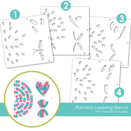 The Painterly Layering Stencil set is sure to add some flair to your projects! This set of four layering stencils creates a brushstroke heart, butterfly, and semi circle that are fun to use all together or individually. Our Painterly Dies (sold separately) can be used with these stencils to cut out both the heart and butterfly for added creative freedom. Consider using the semicircle as a backdrop or as your featured design element with a paintbrush from the Paint the Town die set (sold separately). You can create so many fun color combinations using this lively layering stencil set!