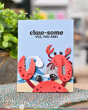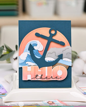 This set features a large wave and rock design that fits perfectly across a vertical A2 card (4.25” wide). It also includes a matching borderline die to create a sand layer that tucks right beneath the waves. We recommend cutting the main image from white cardstock and using the included stencil to quickly add color. Finish by layering the seafoam pieces—also cut from white cardstock—to make the waves pop!
